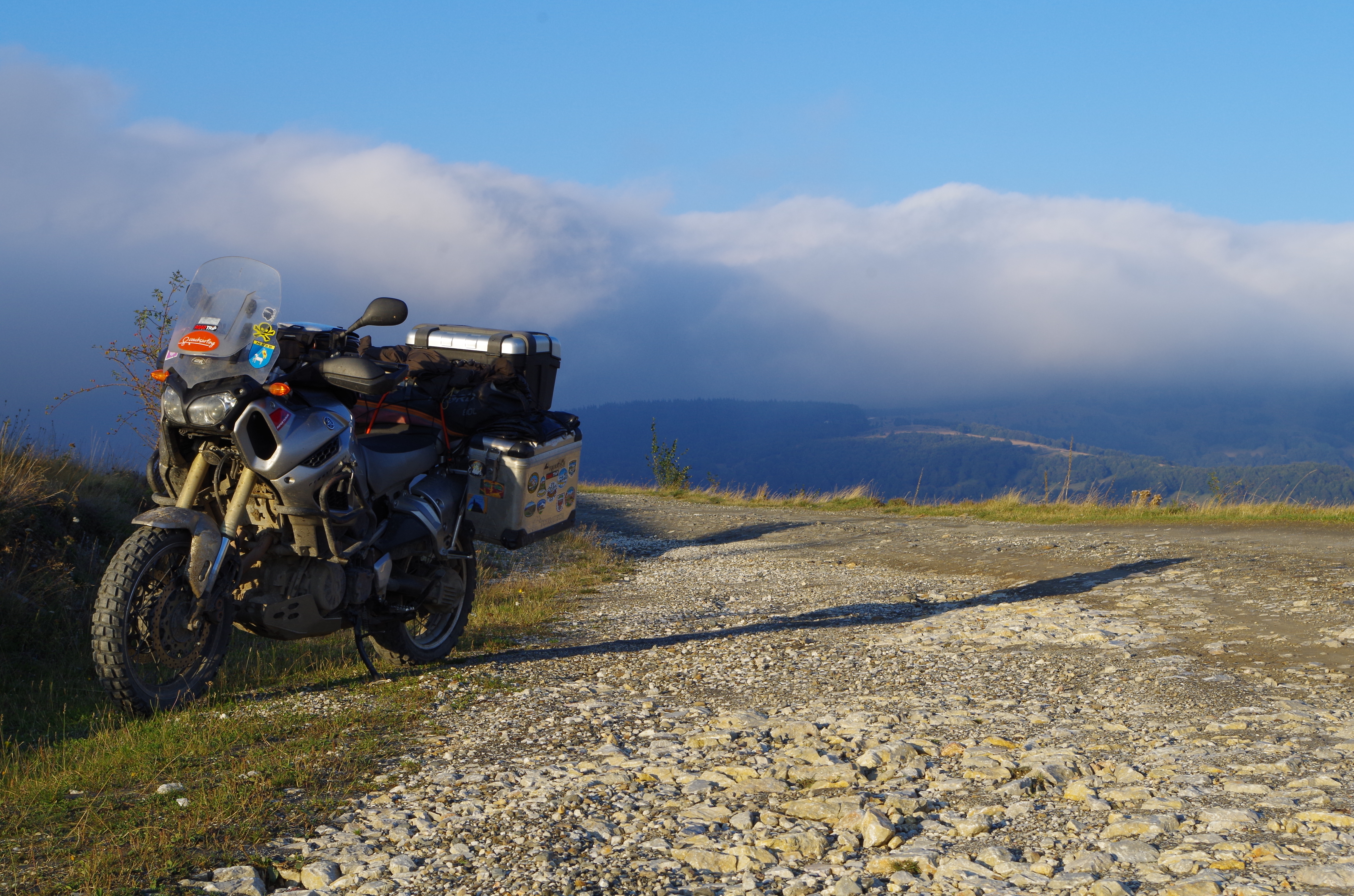 En fin de journée j’ai tout même réussi à me faire plaisir sur une petite piste dans la montagne près de Davolja Varos, la ville du diable… Les pros du tout-terrain disent toujours « regardez loin, anticipez… » mais je crois que les pros ne roulent jamais dans le brouillard… Là on y voit pas à 20 mètres ! Pas facile de rouler sur un chemin sous la pluie et au beau milieu d’un nuage… J’aurai bien testé mes pneus dans des conditions boueuses, mais à chaque fois que j’ai mis du gaz au milieu d’une flaque j’ai manqué de me sortir… Faute de pouvoir anticiper les ornières et les pierres qui trainaient un peu partout… Mais tant pis, c’est quand même sympa et ça égaye une journée routière un peu morose… La navigation à l’aide de panneaux à la fiabilité douteuse amène aussi un peu de piment !