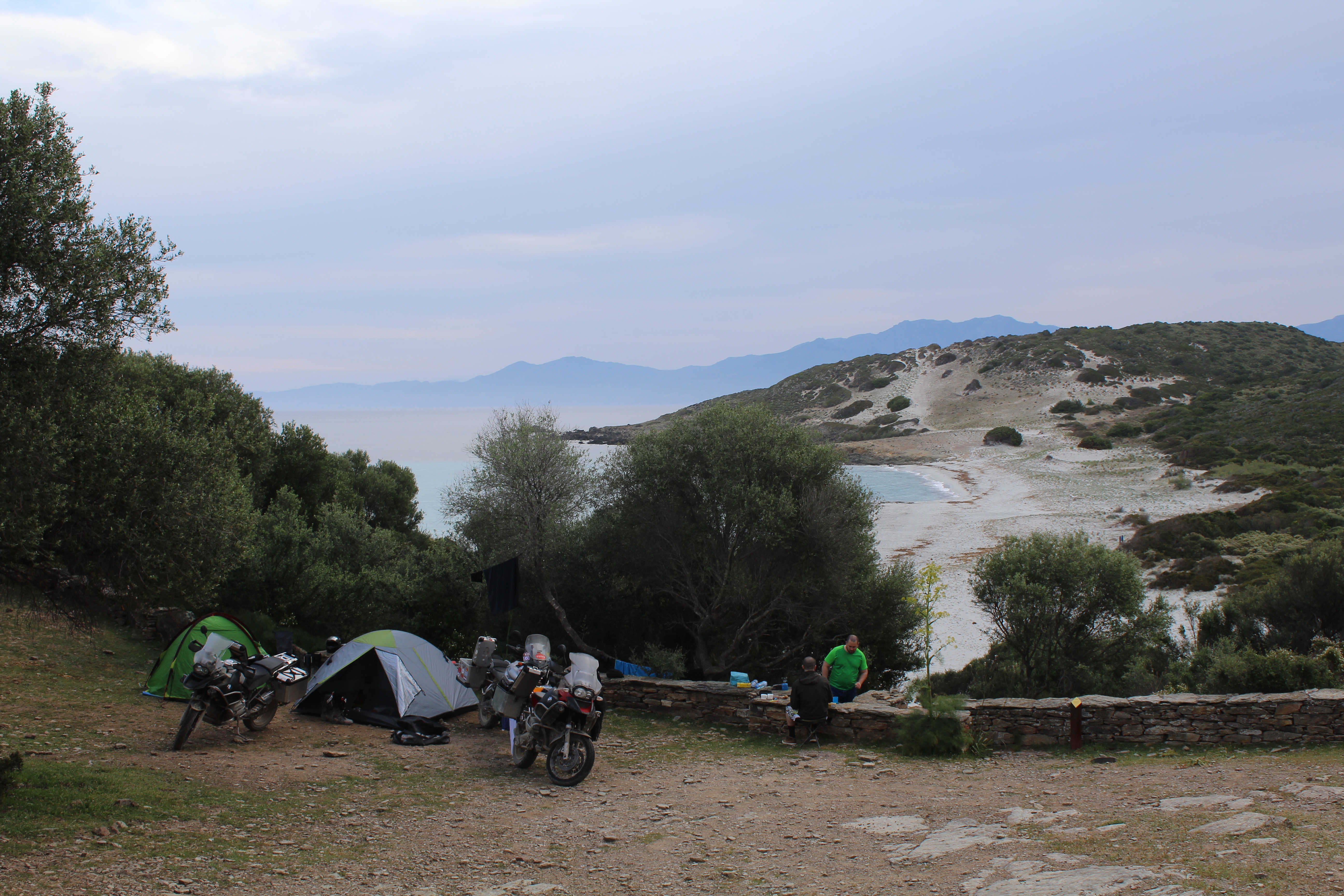 Nous arrivons à l’Île Rousse en fin d’après-midi, avec des petits yeux de motards qui se sont levés beaucoup trop tôt. Juste le temps de faire un ravitaillement que nous poursuivons notre route vers le désert des Agriates. Notre « intense préparation » nous a révélé une piste qui mène jusqu’à la mer… Ça sera parfait pour un premier bivouac !